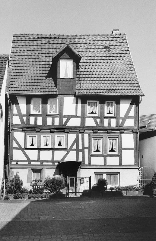 Traufständiges Wohnhaus unter steilem Satteldach mit ehemaliger Ladeluke. Das Erdgeschoss massiv, ehemals mit zwei Eingängen. Die Fachwerkgeschosse wurde in zwei Bauphasen errichtet, der linke Teil des ersten Obergeschosses mit den breit gestellten Diagonalstreben lässt eine Datierung ins späte 17. Jahrhundert zu, rechts evtl. die umgebaute Scheune, das zweite Obergeschoss entstand im 18. Jahrhundert.