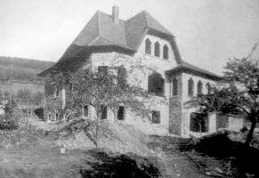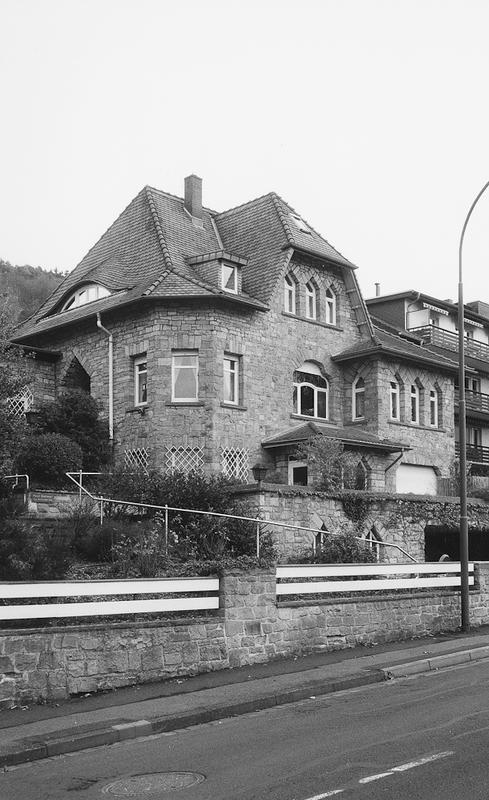 Zweigeschossige Villa um 1925 nach Plänen des Architekten Rudolf Breuer (Architekturbüro Schmitt-Breuer) für den katholischen Geistlichen, Prof. Pott als Altersruhesitz errichtet. Von seinem heutigen Besitzer wurde der gesamte Hang in die Konzeption einbezogen und mit Sandsteinmauern, Treppen und Terrassen um 1970 in angepasstem Stil gestaltet. Auf dieser künstlichen Terrasse thront der mit Zwerchhaus, Altan und polygonalem Eckbau reich gegliederte, wuchtige Sandsteinbau in späthistoristischen Formen, die mit den von Rudolf Breuer bevorzugten spitzgiebligen Fenstern und den scharfkantigen Dächern dennoch klar in den Expressionismus weisen. (Vergl. Trinkbrunnenhalle, Bad Orb, Villa Alte Leipziger Str. 42 in Gelnhausen) Im Zentrum des ersten Obergeschosses dreiteiliges Buntglasfenster mit breitem Oberlicht in geschwungenen Formen. Bewegte Dachlandschaft aus hohem Walmdach, auf der Nordseite Fledermausgaube, am Zwerchhaus und Eckbau mit Schopfwalm. Außergewöhnlicher Villenbau zwischen dem längst ausklingenden Historismus und dem Expressionismus.
