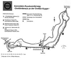 Dank der politischen Kleinteiligkeit des Kreisgebietes mussten zahlreiche Grenzen abgemarkt werden. Vor allem im südlichen und östlichen Kreisgebiet sind in den Wäldern noch zahlreiche Grenzsteine im Laub verborgen. Nördlich Bad Orbs führt ein markierter Grenzstein- Wanderweg entlang der alten Grenzen. Er berührt teilweise noch heute bestehende Grenzen zwischen Wächtersbach, Bad Soden-Salmünster und Bad Orb, dem Stadtwald Bad Soden-Salmünster und dem Staatswald des Gutsbezirks Spessart und den Landkreisen Gelnhausen und Schlüchtern. Die Steine markierten folgende historischen Grenzen: Gruppe 1: Nördlich von Bad Orb unterhalb der Eisenbergkuppe markieren die wenigen noch erhaltenen Grenzsteine die Territorialgrenze zwischen dem büdingischen Gebiet und Kurmainz. Die kleinen, gewölbten Steine zeigen die Wolfsangel, Zeichen der Herren v. Forstmeister zu Gelnhausen für Aufenau und ein O für Orb, also Kurmainz. An den Schmalseiten die laufende Nummer mit gekreuzter Weisung am Kopf. Gesetzt um 1732. Gruppe 2: Die 1775 gesetzten Zweimärkersteine kennzeichneten die Territorialgrenze zwischen dem Kürfürstentum Mainz (Curfürstentum Maintz CM) und dem Fürstbistum Fulda (FF). Ca. 40 cm hohe, gewölbte Sandsteine, durchlaufend nummeriert, mit doppelter Weisung. Am sogenannten Dreiländereck befindet sich der Hauptstein, letzter Stein der historischen Grenze. Ca. 60 cm großer Vierkantpfeiler aus Sandstein, ein Zweimärker, der erhaben das Fuldische Kreuz und das Mainzer Rad zeigt, die Jahreszahl 1775 und die laufende Nummer 173. Gruppe 3: Lange Versteinung auf der Grenze zwischen dem Stadtwald Salmünster (SS) und dem Fürstlich Fuldischen Wald (FF), gesetzt vor Auflösung des Fürstbistums Fulda 1802. Vierkantsteine mit rundgewölbtem Kopf und fortlaufender Nummerierung. Gruppe 4: Gemarkungsgrenze mit ehemaligem Landwehrgraben zwischen Aufenau und Salmünster, die von Zweimärkern mit den Initialen A für Aufenau und S für Salmünster gekennzeichnet ist. Beispielstein mit nicht gesicherter Jahreszahl 1819. Grenzsteine mit den Initialen KH für Kurfürstentum Hessen und KB für Königreich Bayern, die zwischen 1814 und 1866 die Grenze zwischen beiden Staaten markierten. Knapp einen Meter hoher Vierkantsteine mit spitzemgiebeligem Abschluss und rechteckigem Aussparung für ehemals vorhandene Zaunstangen. (nach Edmund Acker: Dreiländereck an der Großen Kuppe, Faltblatt zum Grenzstein- Rundwanderweg, 1989)