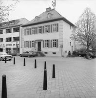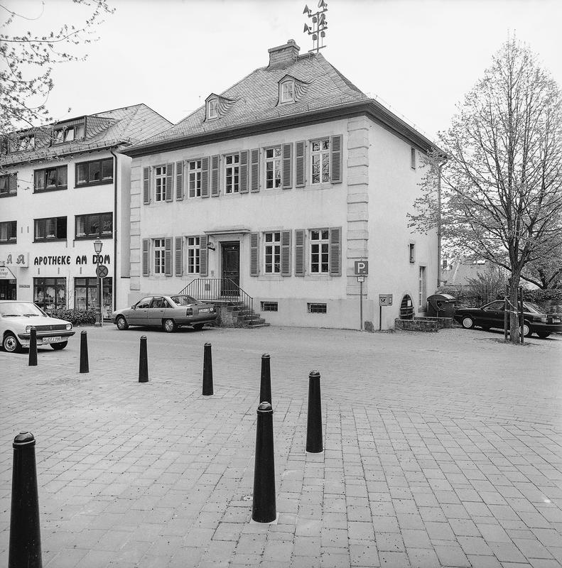 Die Grundsteinlegung der Frühmesserei ist für 1782 überliefert. Der Massivbau an der Ecke Steinheimerstraße bildet die südöstliche Platzbegrenzung. Die blockhafte Wirkung des Gebäudes wird verstärkt durch das verschieferte, von einem Kamin gekrönte Walmdach und den strengen, fünfachsigen Fassadenaufbau mit gequaderten Ecklisenen und vorgesetzter zweiläufiger Freitreppe. Mitteleingang mit schlichter Holztüre in geschnitztem Rahmen, darüber gerade Verdachung. An der Westseite rundbogiger Kellereingang. Ein eingeschossiges Wirtschaftsgebäude an dieser Stelle wurde nach 1974 abgebrochen. Der zugehörige rechteckige Garten ist von einer Mauereinfriedung umgeben.