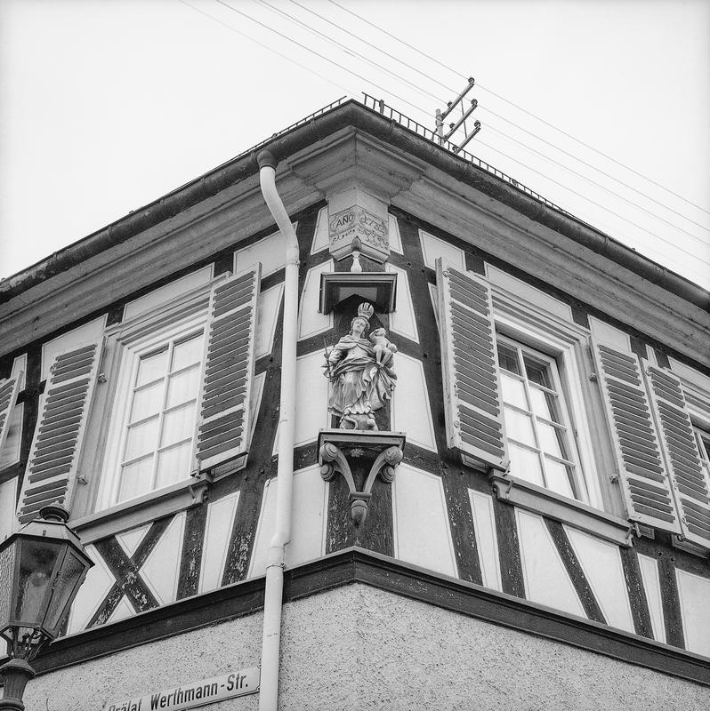 Zur Platzecke hin auf geschnitzter Konsole, von einem Baldachin überdacht, farbig gefasste Holzfigur der Maria als Himmelskönigin, 18. Jhs.