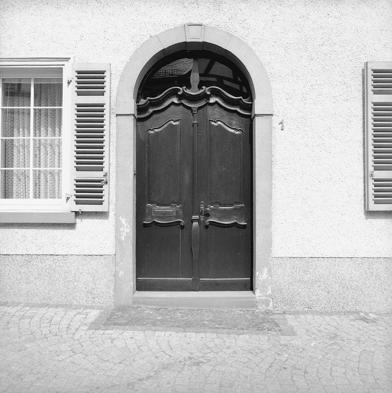 Stattliches Eckgebäude am Bischof-Blum-Platz über verschobenem, viereckigem Grundriss mit massivem Erdgeschoss, Fachwerkobergeschoss und verschiefertem Walmdach mit kleinen Gauben. Die Fenster bilden in Achsen angeordnete Gruppen. An der Langseite zur Prälat-Werthmann-Straße zwei rundbogige Eingänge in Sandsteingewänden, darin qualitätvoll geschnitzte, zweiflügelige barocke Türen mit geschwungenen Kämpfern und Oberlicht. Das nur konstruktive, ursprünglich verputzte Fachwerk des Obergeschosses zeigt als ungewöhnliches Detail an den stärkeren Bundpfosten kurz unter der Traufe ansetzende, im Traufgesims verkröpfte, durch Bemalung und Inschrift hervorgehobene Holzkonsolen und war wahrscheinlich durch aufgeputzte oder gemalte Pilaster in großflächige Felder gegliedert, eine im Rheingau seltene Fassadengestaltung. Die Eckkonsole trägt das Baudatum ANNO 1732. Nach Osten schließt eine korbbogig geschlossene, überdachte Hofeinfahrt an. Die Hoffassade modern verändert.