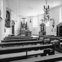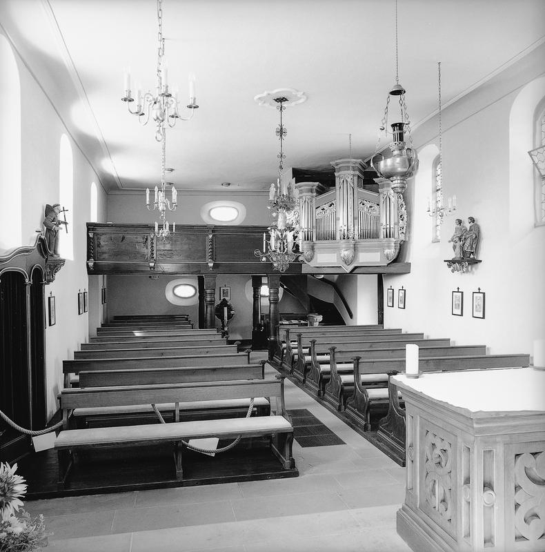Innenraum: Saal mit Spiegeldecke auf flacher Kehle und erhöhte Chornische. Westempore um 1700 aus Holz, auf vier gedrungenen Säulen; die Brüstungen mit gedrehten Säulen und Abschlussgesims stammen von der ehemaligen Kanzel der Pfarrkirche in Rüdesheim.