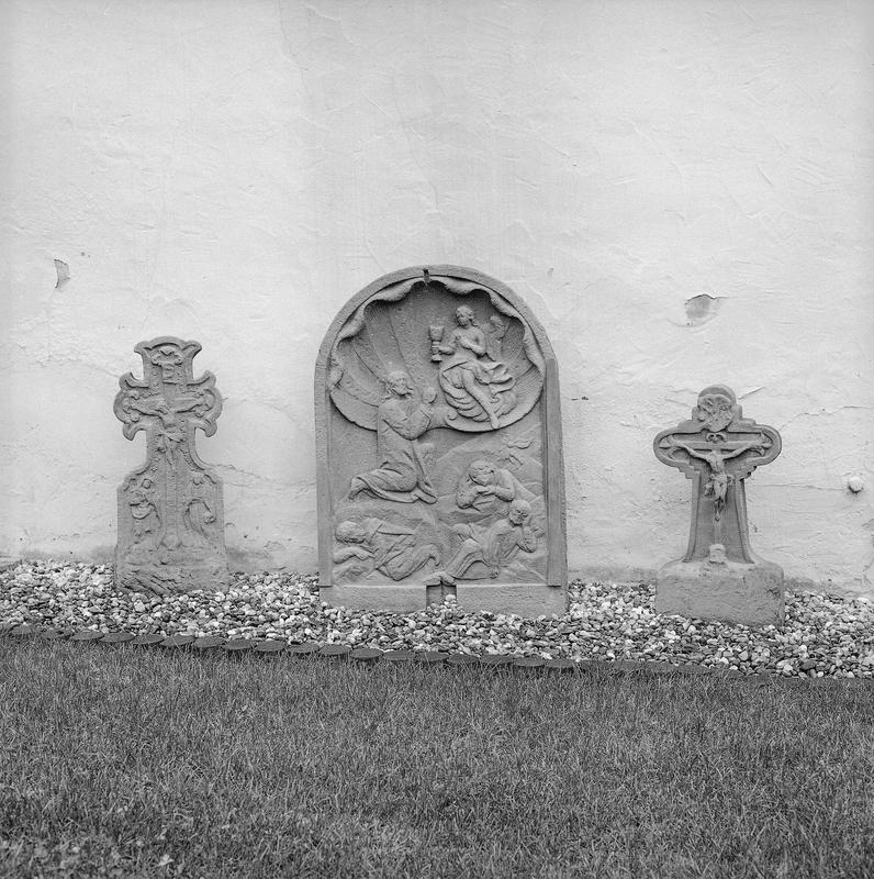 Zwei Grabmäler des 18. Jhs. auf dem Friedhof bei der Kirche. Ausgesägter Sandstein in Kreuzform mit geschweiften Enden, darauf in Relief Kreuzigung.