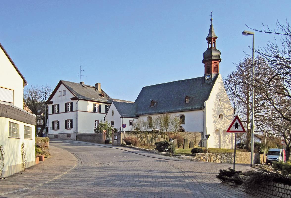 Nahe dem Ortsmittelpunkt liegt die Kirche innerhalb des Friedhofs. Kleiner Saalbau mit rechteckigem Schiff, abgerundeten östlichen Ecken, eingezogenem, halbrundem Chor und rechteckiger Sakristei an der Nordseite. Äußeres schlicht, aus verputztem Bruchsteinmauerwerk, darin flachbogige Sandsteintürgewände mit Jahreszahl 1749 im Scheitelstein. Segmentbogige Fenster in (überputzten) Holzgewänden, nach Westen Schildwand mit zwei Ovalfenstern. Verschiefertes Satteldach, gekrönt von kleinem Dachreiter mit Haube und Laterne.