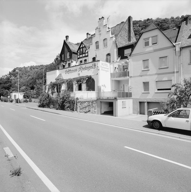 Das 1906 erbaute Gasthaus bildet den westlichen Endpunkt einer kurzen Gebäudezeile, die zwischen Bahnlinie und Rheinuferstraße von der zusammenhängenden Ortsbebauung abgesetzt wurde. Die Standortwahl reagierte vermutlich auf den damals anwachsenden Durchreiseverkehr auf der Rheinuferchaussee. Das historistische Gebäude mit hohem Schieferdach erhält seine malerische Wirkung durch die kleinteilige Vielfalt seiner Dachausbauten; hier stehen ein massiver Treppengiebel, eine Fachwerkgaube und ein verschieferter Zwerchhausgiebel nebeneinander. Der Erdgeschossbereich wird durch einen augenscheinlich nachträglich vorgesetzten, massiv wirkenden Terrassenvorbau mit Bogenöffnungen teilweise verdeckt. Jedoch bleibt die Fernwirkung der drei unterschiedlich gestalteten Giebel in der Rheinfront des Ortes erhalten.