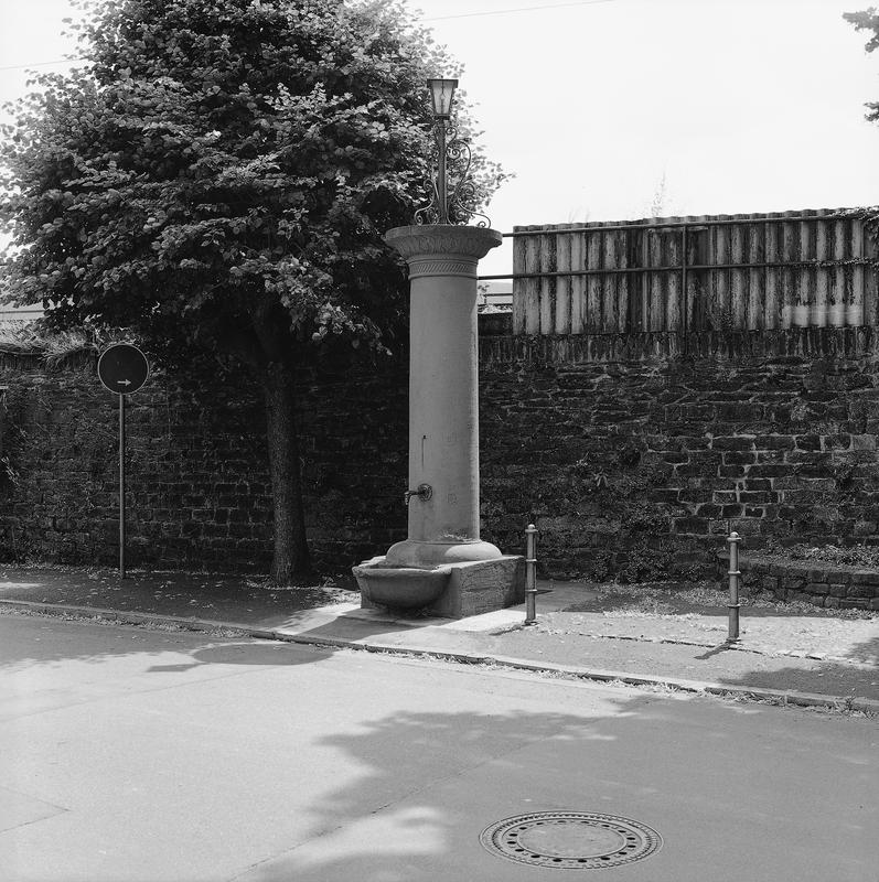 Sandsteinbrunnen der Zeit um 1800. Standort gegenüber Haus Rheinstraße 52. Die kräftige Rundsäule endet in einem Kapitell mit Akanthusfries. Quadratischer Sockel mit halbrund auskragendem Becken, darüber Wasserauslauf in Form eines Tierkopfes. Im Rheingau verbreitete klassizistische Brunnenform; ähnlich dem Brunnen von 1794 in der Schaar. Nach Erhöhung des Straßenniveaus wirkt der Brunnen jetzt etwas „abgesunken".