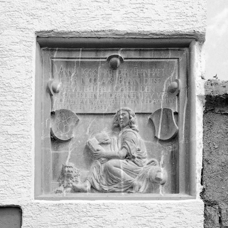Die in die Hauswand eingelassene Spolie aus grauem Marmor zeigt im Relief den Evangelisten Markus (?), darüber zwei Wappenschilde, eines mit Zunftzeichen und Initialen NB (Nikolaus Braun), das andere leer. Darüber in einem rechteckigen Feld die Inschrift: „ANNO 1645 HAT DER EHRNHAFFT HERR NICOLAVS BRAVN DIESE VHRALTE S. MARCI CAPELL DEN GOTTESDIENST DARINNEN ZV VERRICHTEN ZV EWIG WEHRENDEN GEDAECHTNVS REPARIREN LASSEN".