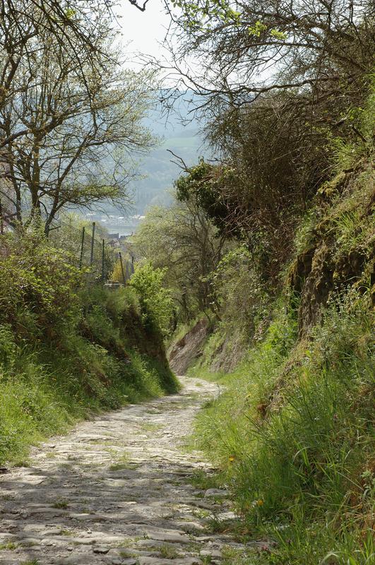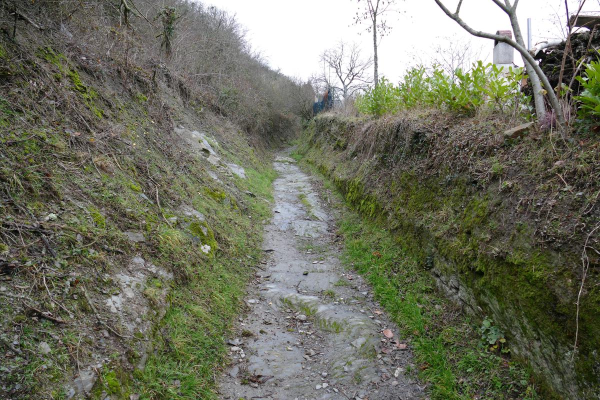 Alter Weg nach Weisel, der hier auch Bettelpfad genannt wird. Er hat sich nicht wie die überwiegende Mehrzahl der Hohlwege durch jahrhundertelange Nutzung in den Untergrund eingetieft, sondern wurde streckenweise in das anstehende Gestein eingehauen. An einigen Stellen, an denen seine Sohle aus gewachsenem Felsen besteht, sind die „Gleise“, parallel verlaufende, durch eisenbereifte Fahrzeugräder entstandene Rinnen noch erkennbar. Teilweise findet sich eine Pflasterung aus örtlichem Naturstein. Dieser Altweg steht wahrscheinlich im Zusammenhang mit dem auch als Kaufmannsweg bekannten Hohlweg am Hang jenseits der Wisper. Unmittelbar an seinem Beginn an der Straße Weiselberg haben sich Reste des Weiseler Tores erhalten, die ebenfalls auf die frühere Bedeutung dieses Weges hinweisen: An eine Trockenmauer aus örtlichem Material anschließender Baurest aus hellen Kalksteinquadern mit Teilen aus rotem Sandstein. Sie sind Kulturdenkmal aus geschichtlichen Gründen.