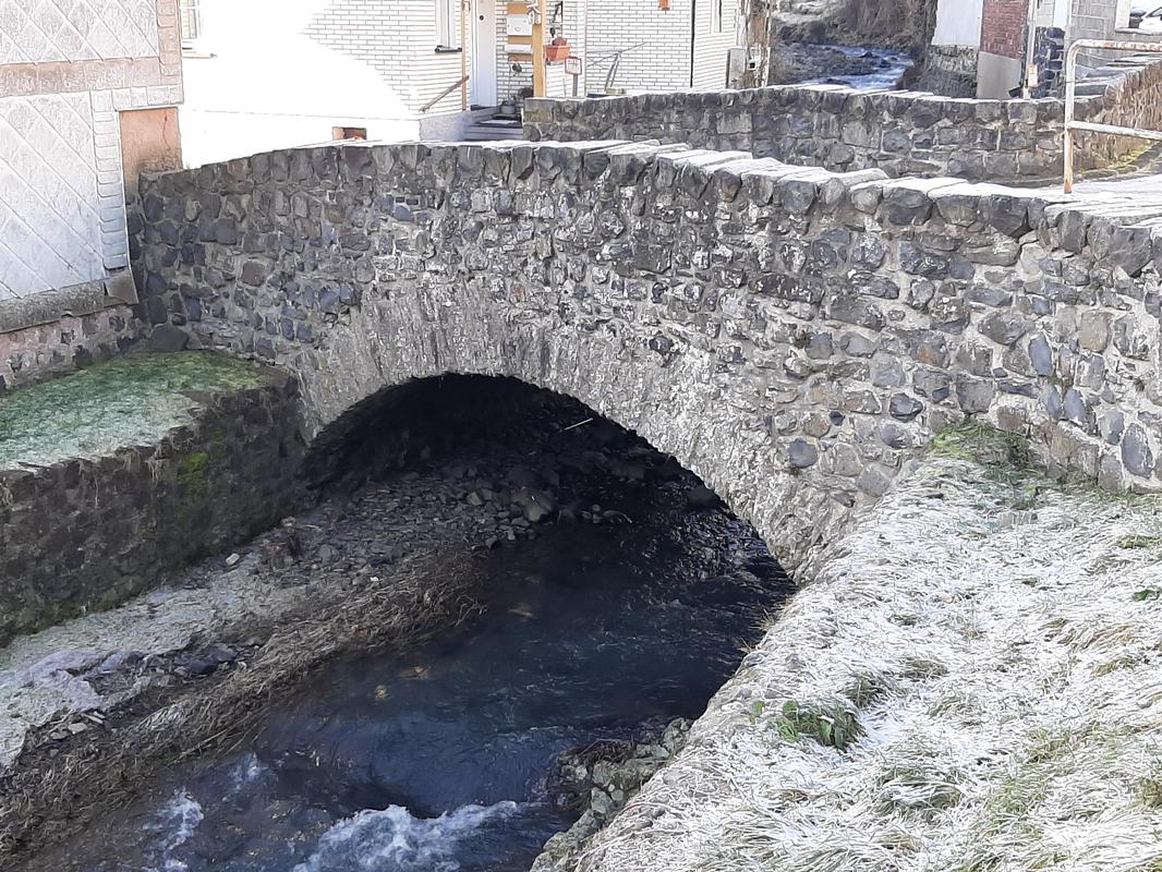 Einbogige Basaltsteinbrücke des 18. Jh. über dem Ulmbach. Die Brücke erschließt die ursprünglich nicht bebaute linke Ulmbachseite.