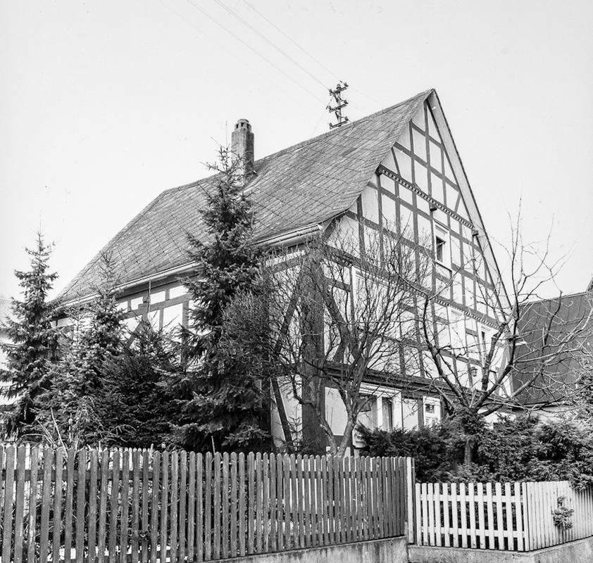 Mit durchgehenden Ständern errichteter zweigeschossiger Bau, der inschriftlich 1604 datiert ist. Bemerkenswert sind die die Eckständer aussteifenden, zwei Geschosse hohen Streben. Dach- und Kehlbalken sind mit Klötzchenfriesen geschmückt. Vom Typus handelt es sich um ein dreizoniges, von der Giebelmitte her erschlossenes Hallenhaus. Innerhalb des Hausformengefüges des Dillgebietes ist der Bau von geschichtlicher und wissenschaftlicher Bedeutung.