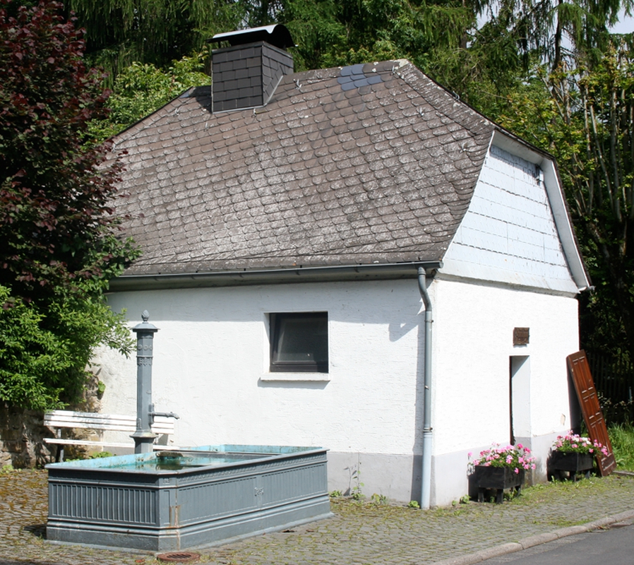 Backhaus der Gemeinde in der Senke der Brunnenstraße. Verputzter, eingeschossiger Fachwerkbau mit Krüppelwalmdach und Schieferdeckung. Angeschlossen ein kleiner Platz mit gusseisernem Laufbrunnen. Dieser baugleich mit dem Laufbrunnen am Schultürmchen.
