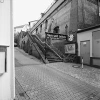 Treppenaufgang der 1885 eröffneten Zahnradbahn zum Niederwald, der seit der Errichtung des Nationaldenkmals 1883 stark an Attraktion gewonnen hatte. Die Bahn löste frühere Aufstiegshilfen wie Mietesel und Fuhrwerke ab. Die ersten Bahnhofsbauten der Berg- und Talstation bestanden aus Holzfachwerk. Nach zunächst hohem Fahrgastaufkommen trat infolge des Ersten Weltkriegs ein Stillstand ein, danach wurde der alte Zahnradbahnhof in ein Schwesternhaus umgewandelt. 1953 ging mit Eröffnung der neuen Seilbahn auf den Niederwald die erste Seilbahn in Hessen und am Mittelrhein in Betrieb.