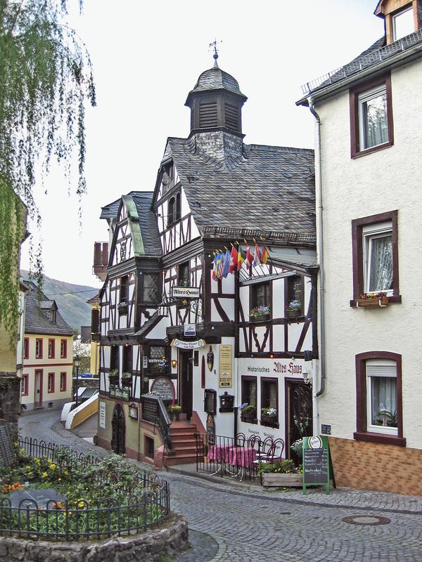 Laut (neu angebrachtem) Datum auf dem Gewände des Kellereingangs 1578 erbautes Fachwerkhaus (früher wurde hier das Datum 1752 festgestellt). Nach Überlieferung einst Gemeindeschmiede und Herberge. Aus dem 17. Jh. sind Nachrichten über das „Gasthaus des Schmiedes Simon Meckel" erhalten. 1926 Verkauf an einen Assmannshäuser Weingutsbesitzer und Instandsetzung. Nach Abbau des Fachwerks sollen die Hölzer nach München transportiert, dort imprägniert und an Ort und Stelle wieder zusammengesetzt worden sein. Heute ist in der durch neue Zutaten überformten Außenfassade wenig Originalsubstanz erhalten, auch wurde das Umfeld gravierend verändert. Dennoch entspricht das als eines der wenigen baulichen Dokumente des alten Assmannshausen von Bränden und Abbruch verschont gebliebene, pittoreske Gebäude in besonderem Maße der romantischen Vorstellung vom malerischen rheinischen Fachwerkhaus und war in Zeichnungen des 19. Jhs. ein häufig dargestelltes Motiv.