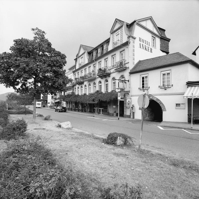 Im Inneren vermauerte Sandsteinfragmente aus Sandstein mit Spruchinschrift über die Erbauung des ehemaligen Großen Tores mit Jahreszahl 1491. Das Hotel ist ein wesentlicher und prägender Bestandteil der Assmannshäuser Uferfront.