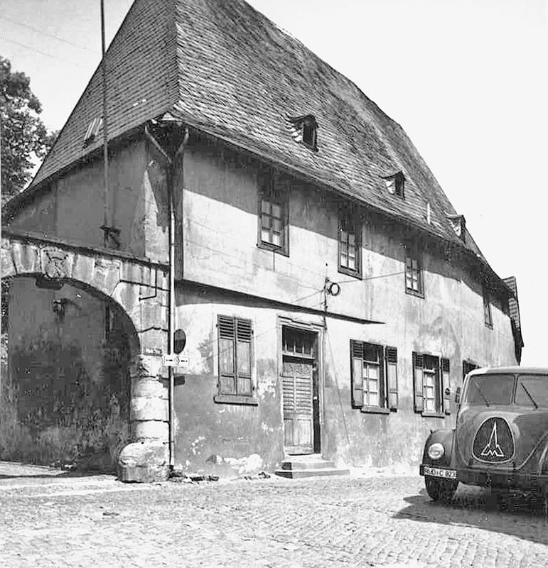 Nach 1965 abgebrochen: Stattliches Tor als Eingang von der Oberstraße aus regelmäßigem Quadermauerwerk mit flachem Bogen und geradem Abschluss, im Scheitel Allianzwappen Brömser-Heddesdorf, mit Jahreszahl 1652. Daran anschließender Südflügel vom Ende des 17. Jhs., der mit seinem Nebengebäude den Eingang zum Ostflügel überbaute. Über einem der Straßenkrümmung folgenden Grundriss massives Erdgeschoss und Obergeschoss aus verputztem Fachwerk; steilhohes verschiefertes Walmdach, Tür mit Ohrenumrahmung.