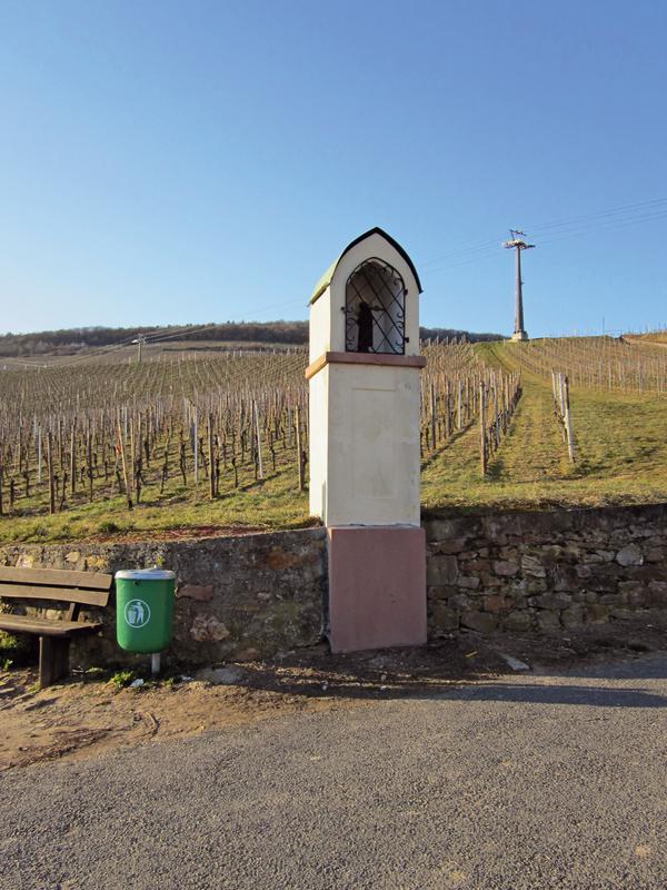 Alter Bildstock an der Grenze eines Zehntgebietes. Ehemals auf Brömser'schem Grund stehend, wurde er von deren Nachfolgern, den Grafen Metternich, möglicherweise um 1680 neu aufgerichtet. Früher nach seinem Anstrich Das rote Kapellchen genannt.1954 im Zuge des Wegeausbaues einige Meter versetzt und neu errichtet. Auf hohem, quadratischem Sockel kleines spitzbogiges Gehäuse mit vergitterter Nische. Darin ein neues Madonnenbildnis.