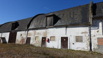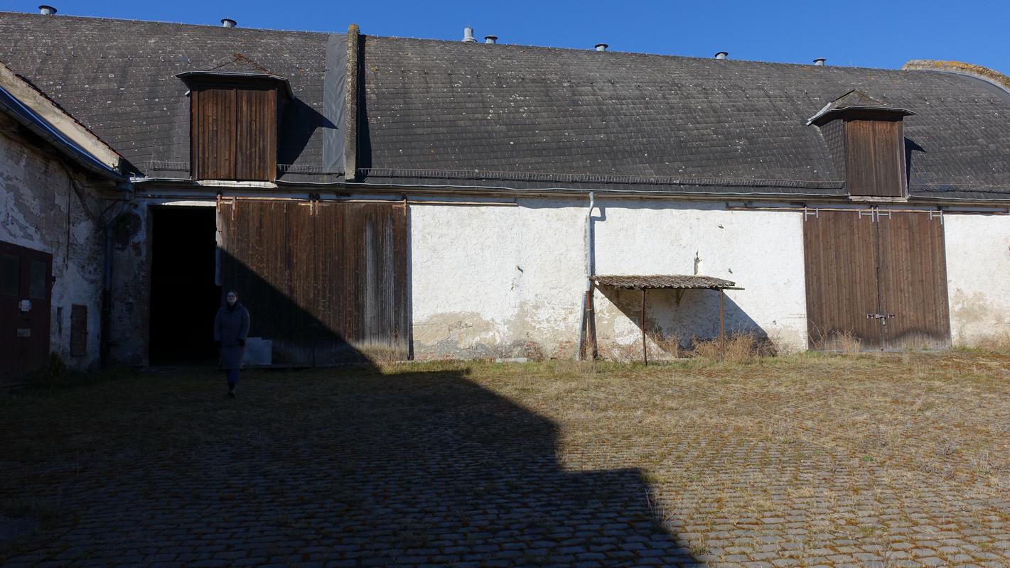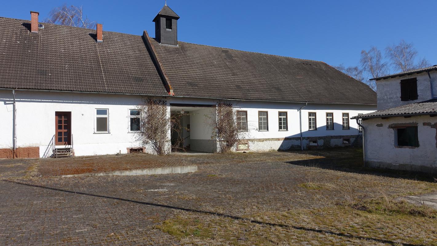 Nach Westen eine Reihe Scheunen und Stallungen mit Spitztonnendächern, größtenteils 1923 als Ersatz von vier abgebrannten Scheunen erbaut. Die nördliche Scheune noch 19. Jh., verändert, hier eine alte Wetterfahne auf der Brandwand. Weitere moderne Wirtschaftsgebäude als Ersatz abgebrochener Bauten.