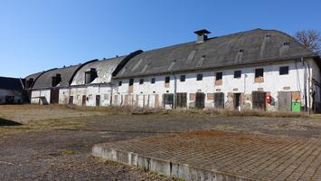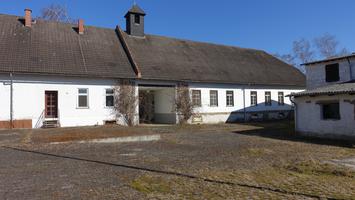 Die ehemals vierseitig-geschlossene Anlage nur noch ansatzweise erkennbar. Das ehemalige Hofhaus nimmt eine Schmalseite ein.