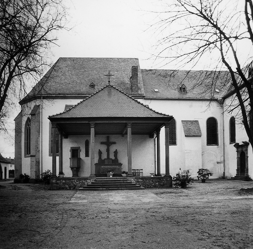 Außen an der Südseite des Chores zwischen zwei Strebepfeilern und von einem Baldachin überdacht ist ein Kruzifix mit einem hölzernen spätgotischen Korpus (um 1500) angebracht. An der Südseite der Rotunde liegt in einer Nische eine barocke Nachbildung der Pietà von dem Aschaffenburger Bildhauer Anton Wermerskirch von 1704.