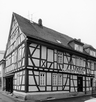 Das ehemalige alte Schulhaus (um die Ecke in der Pfarrgasse gelegen, ehemals Adresse Pfarrgasse 2) ist ein langgestrecktes, zweigeschossiges Fachwerkhaus mit Wildem Mann und Malkreuzen in einigen Brüstungsfeldern. Entstanden im späten 17. Jh. (erbaut 1715, Schulbetrieb bis 1816, gemäß Quelle: Dieburg auf Ansichtskarten einst und jetzt, Dieburg 2002, s.o.), verändert im 19. Jh. Aus dieser Zeit ein Zahnschnitt am Traufgesims und ein Ladeneinbau erhalten. Als Eckbau zu einer kleinen Seitengasse ist das Haus aus städtebaulichen, baukünstlerischen und geschichtlichen Gründen ein Kulturdenkmal.