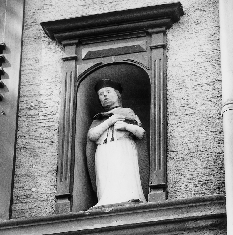 Als Denkmal zur religiösen Volkskunde ist die Figur des Hl. Johann von Nepomuk anzusehen, die in einer klassizistischen Nische an der Ostfassade des Hauses im Obergeschoss aufgestellt ist. Der Brückenheilige, als vollplastische Figur in einfachen bäuerlichen Formen gearbeitet, blickt zur Brücke über den Herrngraben, die den Eingang zur ehemals befestigten Stadt von Osten her bildete.