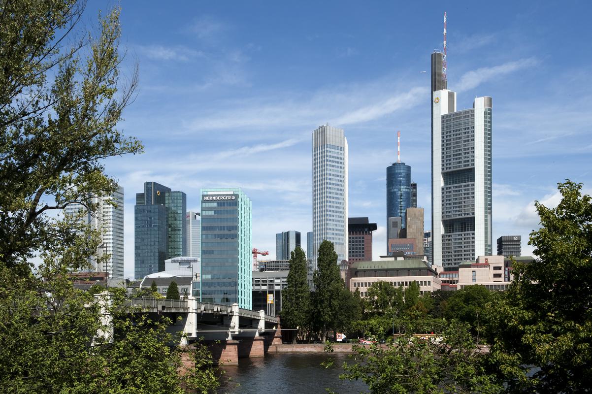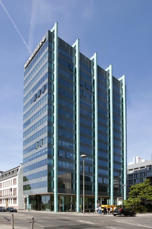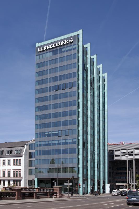 Hochhaus für die Schweizerische Nationalversicherung Basel von M. Meid und H. Romeick 1964 in exponierter Lage an der Untermainbrücke realisiert. Zur Bauzeit außergewöhnliche Konstruktion aus außenliegenden Stahlbetonrahmen, in die 17 Geschosse eingehängt sind. Vorhangfassade aus Bronze und Glas, Stützen kupferumantelt.