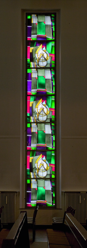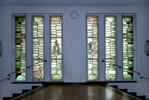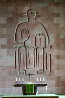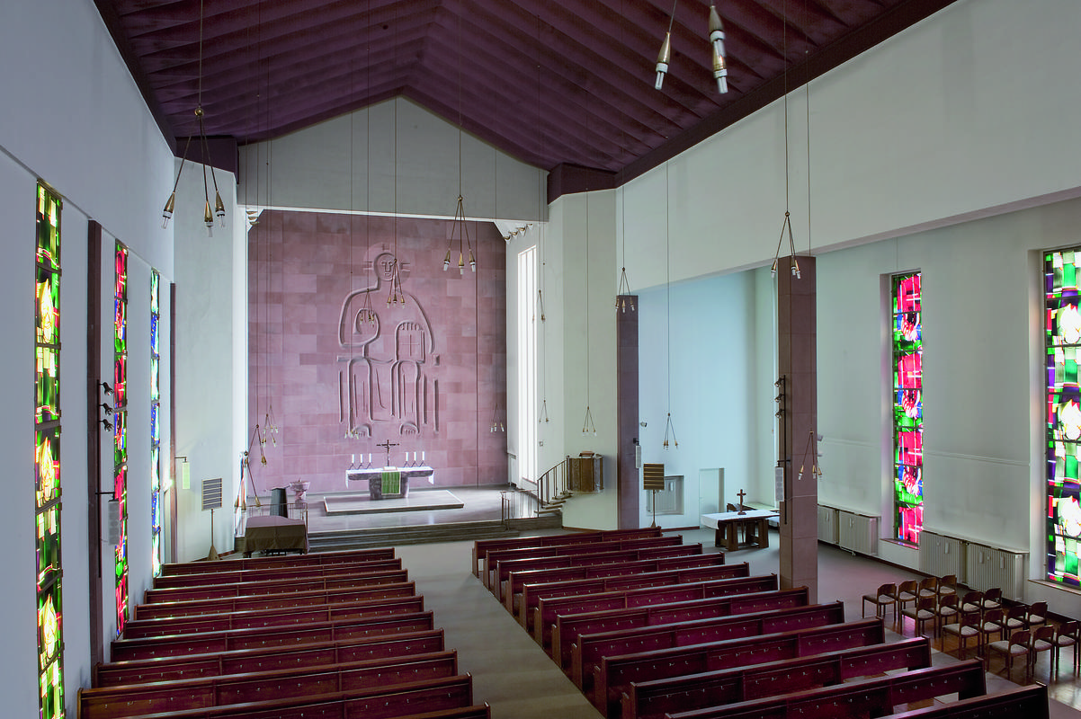 Als erster von Kirchensteuermitteln finanzierter Kirchenbau Frankfurts, wurde die Matthäuskirche 1905 nach Plänen des Darmstädter Architekten Friedrich Pützer errichtet. Die innovative Verbindung von Gemeinderaum im Unter- und Gottesdienstraum im Obergeschoss wurde auch nach der Kriegszerstörung 1944 beibehalten. Ruinenteile einbeziehend, gestaltete Oberbaurat Ernst Görcke den Wiederaufbau bis 1955 nach dem Rummelsberger Programm als längsgerichteten künstlerisch ausgeschmückten Feierraum. Von den ausgewählten bildenden Künstlern dürfte Hans-Bernt Gebhardt der Gemeinde durch seine Erdkarte in der benachbarten Goetheschule vertraut gewesen sein. Hans Mettel und Georg Meistermann prägten zeitgleich die großen römisch-katholischen Neubauten: ob Mettels Kerbreliefs an der Allerheiligen-Kirche (1953) oder Meistermanns Kryptafenster in St. Michael (1954). Meistermann und Mettel, beide an der Städelschule lehrend, bewegten sich damals an der Grenze zur Abstraktion. Mettels Altarwandrelief zeigt den apokalyptischen Weltenrichter mit dem Buch des Lebens und einer versöhnlichen Segensgeste. Im Schiff verband Meistermann christologische Chiffren wie den Fisch mit Zeichen des Heiligen Geistes, um auf dem Treppenabsatz das endzeitliche Buchstabenpaar als Gegenpol zum apokalyptischen Altarwandrelief zuwählen. Gebhardt blieb nah an der überlieferten Bildwelt, indem er die Evangelisten figurativ über ihr jeweiliges Zeichenwesen stellte. Als das nordwestliche Seitenschiff in den 1970er Jahren für den Kindergarten abgetrennt wurde, versetzte man Meistermanns Fenstergestaltung zum Hauptschiff hin und muss diese nun künstlich belichten.