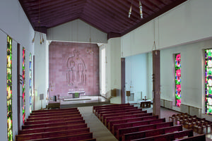 Die Räume der Matthäuskirche werden über ein Treppenhaus und einen Fahrstuhl erschlossen: Im Untergeschoss ist der Gemeindesaal verortet, während der Gottesdienstraum im Obergeschoss liegt. Der Kirchenraum zeigt sich als zweischiffige Halle mit Haupt- und Seitenschiff. Nach Nordwesten um drei Stufen erhöht, wird der eingezogene Altarraum indirekt belichtet. Die Altarwand bestimmt eine sieben Meter hohe Reliefdarstellung des thronenden Christus. In die rottonigen Sandsteinplatten sind abstrahierende Umrisslinien eingekerbt, so dass der seitliche Lichteinfall die Gestalt durch Schattenwurf plastisch formt. Den Altarraum begleitet nach Nordosten eine Kanzel, die fünf hochrechteckige Bronze-Flachreliefs trägt. In ihrer Mitte das Christusmonogramm, zeigt jede Bronzetafel die figurative Anmutung eines der vier Evangelisten über seinem jeweiligen Zeichenwesen. Die Seitenwände bestimmen jeweils vier hochrechteckige farbige Bleistegfenster. Gereiht wiederholen sich insgesamt vier abstrahierende Motive: Flammen nach oben oder unten weisend, Tropfen und sich kreuzende Wasserströme mit Fisch. Auf dem Treppenabsatz vor dem Kirchenraum umfängt eine Gruppe von sechs hochrechteckigen Fenstern eine grautonige Glasgestaltung: die Buchstaben Alpha und Omega in einem Liniengeflecht.