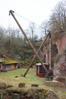 Der hölzerne Derrick-Kran von 1952, der zwischenzeitlich nach Originalplänen annähernd vollständig erneuert wurde, und das dazu gehörige Windenhaus. Er gilt zumindest in der Bundesrepublik als einzigartig.