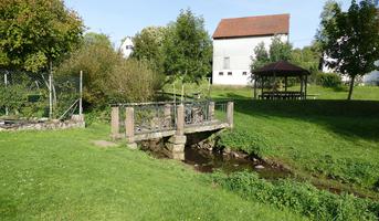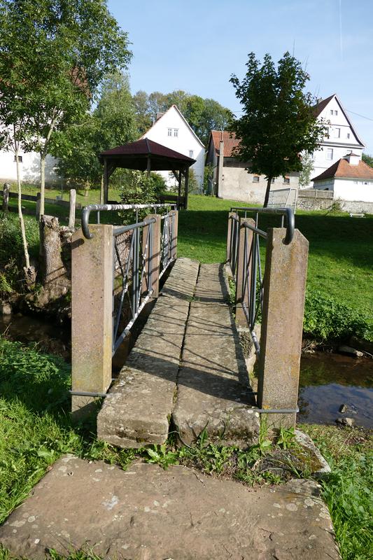Historischer Steg wohl des 18. Jhs. Zwei Sandsteinblöcke, in die Sandsteinpfosten eingesteckt sind, die das hölzerne Geländer trugen, dienen als Auflager. Darauf liegt der Steg aus zwei jeweils ca. 2,50 m langen Sandsteinplatten bestehend, die das Bachbett frei überspannen (vgl. Steg im Büdinger Schloßpark). Kulturdenkmal wegen seiner technischen Bedeutung als historisches Brückenbauwerk.
