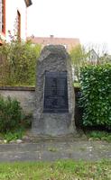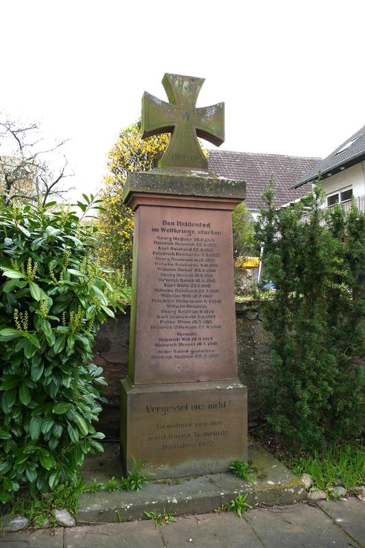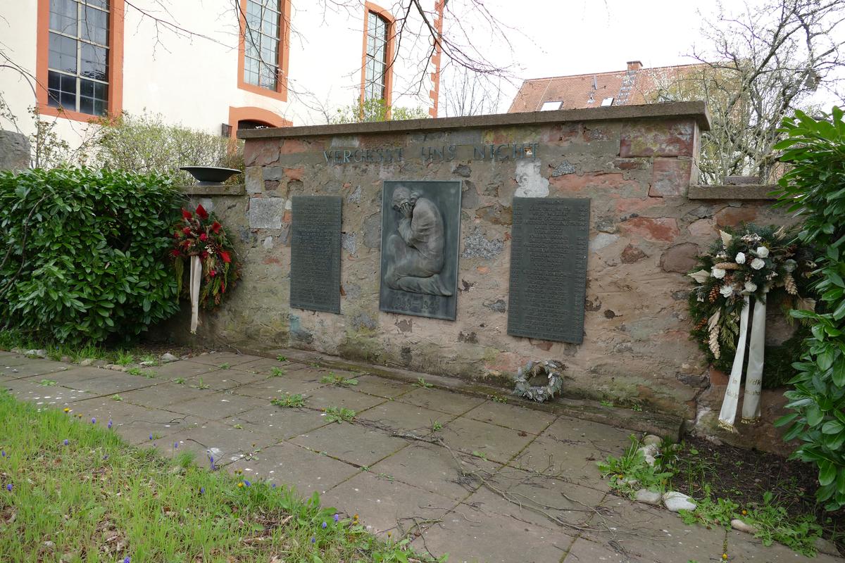 Auf dem Kirchhof ein Ensemble von drei Gefallenendenkmalen. Ein Steinfindling mit Gedenkplatte für die Gefallenen von 1870/71, errichtet 1903. Eine Sandsteinstele mit bekrönendem Deutschen Kreuz für die Gefallenen des Ersten Weltkrieges. Für die Gefallenen des Zweiten Weltkrieges drei Metallplatten in den erhöhten Teil der Bruchsteinmauer integriert. Mittig das Relief einer knieend Trauernden, beidseitig davon Platten mit den Namen der Gefallenen, darüber die Metallinschrift "VERGESST UNS NICHT": Beidseitig Metallschalen.