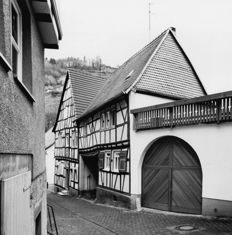 Traufständiges Wohnhaus in der Mühlgasse, durch die einst der Erbach floss und wo sich ein großes Mühlrad befand. Zweigeschossig mit Satteldach, das Fachwerk konstruktiv mit Geschossüberstand und klaren Mann-Figuren. Offene Durchfahrt mit horizontalem Sturzbalken, hier die Jahreszahl 1725 sowie die Initialen CM. In der Durchfahrt Freitreppe zum Eingang.