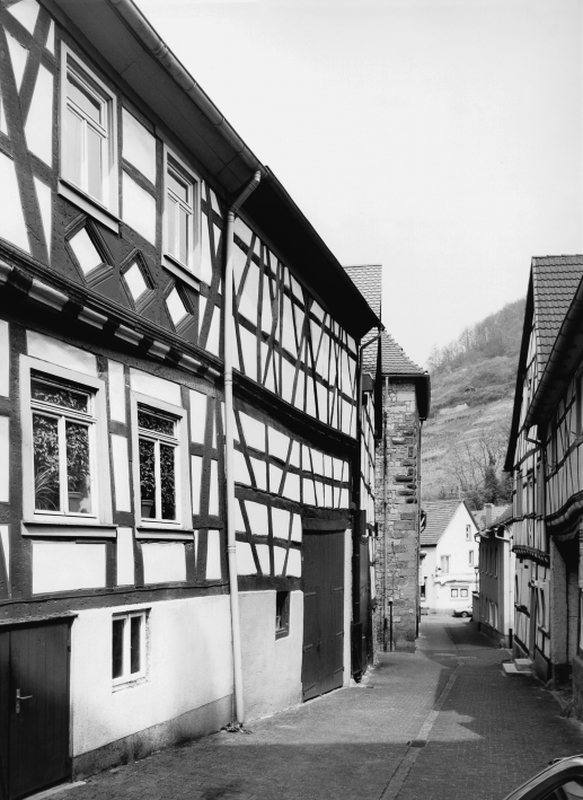 Stattliche Scheune, traufständig mit Satteldach. Das Fachwerk konstruktiv mit mehrfach profilierter Stockschwelle, schöner Mann- Konfiguration mit Gegenstrebe sowie geschosshohen Andreaskreuzen. Große, horizontal geschlossene Toreinfahrt. Als Scheune eines Ackerbürgeranwesens des 18. Jhs. von historischer Bedeutung.