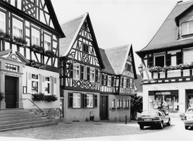 Schöne Fachwerkhofanlage am Großen Markt, Ausgang Kellereigasse. Die zweigeschossige Anlage besteht aus zwei giebelständigen Bauten, die durch einen traufständigen, die rechteckige Durchfahrt überspannenden Flügel verbunden werden. Erdgeschoss verputzt, der westliche Teil massiv erneuert und um zirka einen Meter zurückversetzt, so dass das Obergeschoss stark vorkragt. Das malerische Zierfachwerk mit Formen aus der ersten Hälfte des 18. Jhs., d.h. Mann-Figuren mit geschweiften Kopf- und Gegenstreben, überkreuzte, nasenbesetzte Rauten und reich dekorierte, mit eingetieften Rauten besetzte Brüstungsfelder wie am ehemaligen Posthof. Für die Heppenheimer Altstadt ist dieser Bau von besonderer Bedeutung.