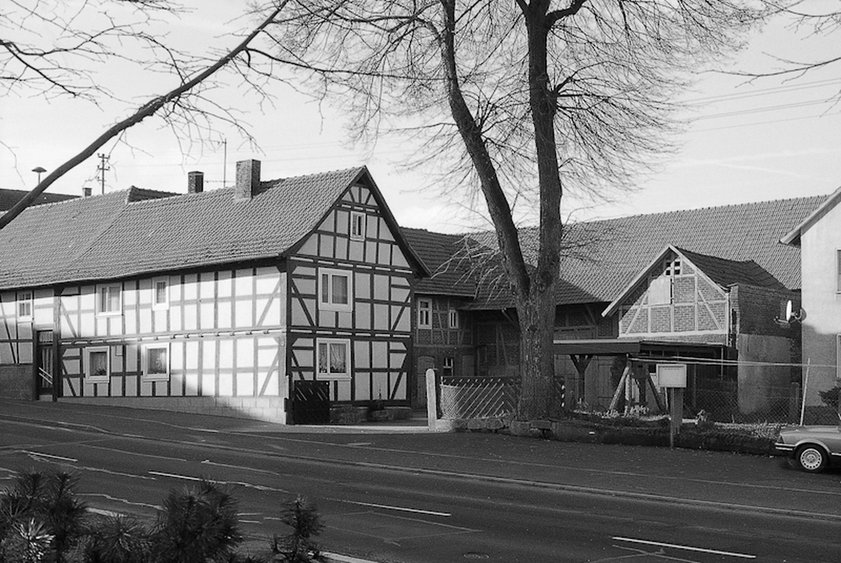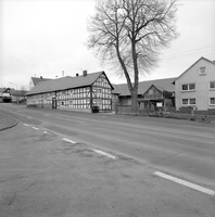Gegenüber der katholischen Kirche in der Ortsmitte stehende Hofreite, deren Bestandteile aus verschiedenen Bauphasen stammen. Das alte Wohnhaus ist ein traufenständiges zweistöckiges Fachwerkgebäude, dessen Erschließung über die Hofseite erfolgt. Die klar gesetzte Konstruktion mit Mannfiguren an den Eckständern und einfacher Verriegelung entstand vermutlich in der Zeit um 1800. Das ehemalige bäuerliche Wohnhaus mit Gaststube besaß ursprünglich ein traufenständig anschließendes Wirtschaftsgebäude, das später abgerissen und durch einen jüngeren Saalanbau in einfachem Fachwerk mit stockwerkshohen Streben ersetzt wurde. Im rechten Winkel zum Altwohnhaus steht ein Wohnwirtschaftstrakt, ein langgestrecktes, hofseitig zweistöckiges Gebäude aus der Zeit um 1900. Das Erdgeschoss wurde in Backstein errichtet, das Obergeschoss in schlichtem konstruktivem Fachwerk mit stockwerkshohen konvergierenden Streben. Zwei weitere winklig anschließende jüngere Wirtschaftsflügel komplettieren das Anwesen zu einer vierseitig umbauten Hofreite. Die etwas verwinkelte, historisch gewachsene Anlage liegt in ortsbildprägender Lage im Zentrum von Leimbach.
