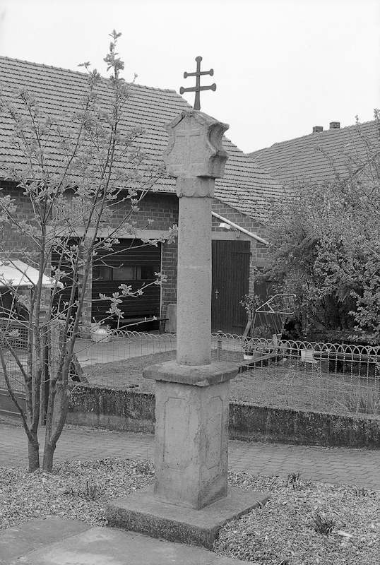Am nordöstlichen Ortsrand stehender Bildstock, der vermutlich um die Mitte des 19. Jahrhunderts geschaffen wurde. Auf einer Sockelplatte erhebt sich ein schlankes Postament mit Zierfeldern und einer quadratischen Platte. Die kräftige Säule mündet in einem achteckig ausgebildeten Abschluss. Der Aufsatz in Form eines geschweiften Bogens mit seitlichen Einbuchtungen wird von einem eisernen Doppelkreuz bekrönt. Das Bildfeld vorne enthält ein Kreuzrelief, die Rückseite ist leer. Der schlichte Bildstock ist ein beredtes Zeugnis örtlicher Frömmigkeit.