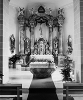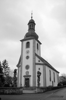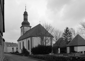 Die katholische Pfarrkirche St. Laurentius ist ein einfacher Barockbau, der in den Jahren 1747-1750 nach Plänen aus dem Baubüro des Fuldaer Hofarchitekten Andrea Gallasini errichtet wurde. Das mit einem Satteldach bedeckte Schiff ist ein Saalbau mit eingestelltem Frontturm und dreiseitig geschlossenem Chor. Die hellen Putzfassaden werden durch kontrastierende rötliche Lisenen gegliedert, die jedoch nicht nur die Gebäudeecken, sondern auch den Sitz der Chorbogenwand, d. h. die Trennung von Schiff und Chor markieren. Das kräftige Traufgesims läuft an der Ostseite schräg an den Turm an. Die Fenster des Schiffes sind rundbogig geschlossen. Der Turm zeigt keine Geschossunterteilung. Auf der Vorderseite sitzt das das einfache Hauptportal mit profiliertem Sturzgesims und dem Wappen des Bauherrn Amand von Buseck (1737-1756). Darüber liegen in zwei Stockwerken Rundfenster, die Schallarkaden sind rundbogig gestaltet. Abschließend wird der Turm durch eine geschweifte Haube mit offener Laterne bekrönt.