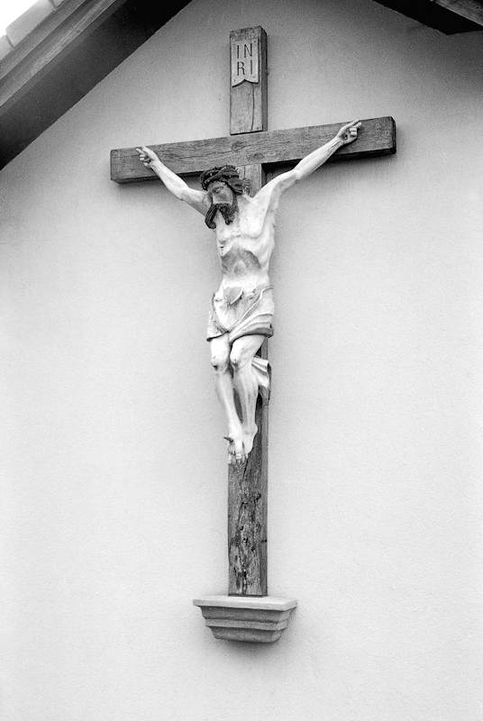 Bei dem an der Aussenwand des modernen Pfarrheimes bzw. Feuerwehr - Gerätehauses auf einer steinernen Konsole angebrachten hölzernen Kruzifix stammt zumindest der Korpus vermutlich noch aus der Barockzeit. Als eines der wenigen erhaltenen und im öffentlichen Raum aufgestellten Holzkruzifixe ist diese qualitätvolle Arbeit unbedingt erhaltenswert.