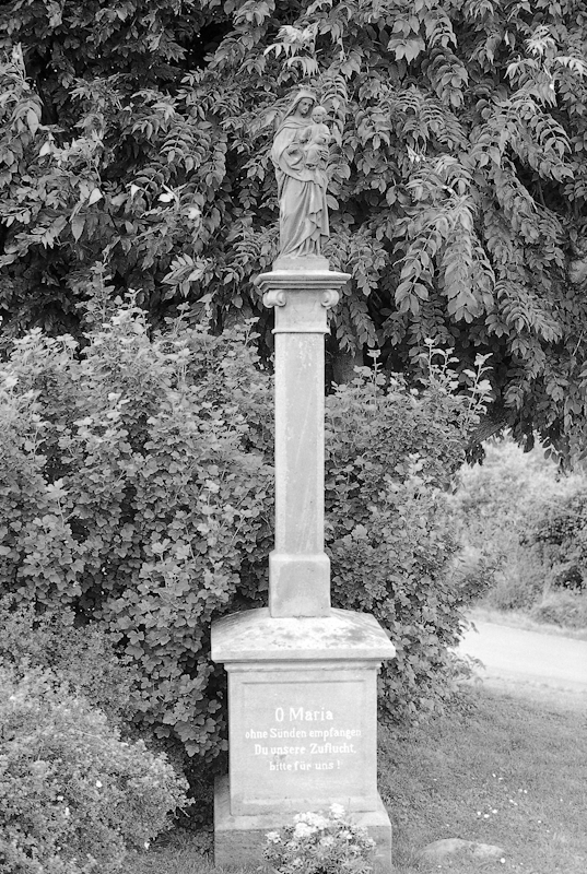 Am östlichen Ortsrand befindliches Standbild der Muttergottes, bezeichnet 1897. Das kräftige Postament mit Inschriften auf Vorder- und Rückseite trägt einen abgefasten Pfosten, der in ein Volutenkapitell mit abschließender profilierter Platte mündet. Der Aufsatz stellt eine kleine solide gearbeitete Vollplastik der gekrönten Madonna mit dem Kind auf ihrem linken Arm dar. Das Standbild verdeutlicht die ausgeprägte lokale Frömmigkeit zum Ende des 19. Jahrhunderts.