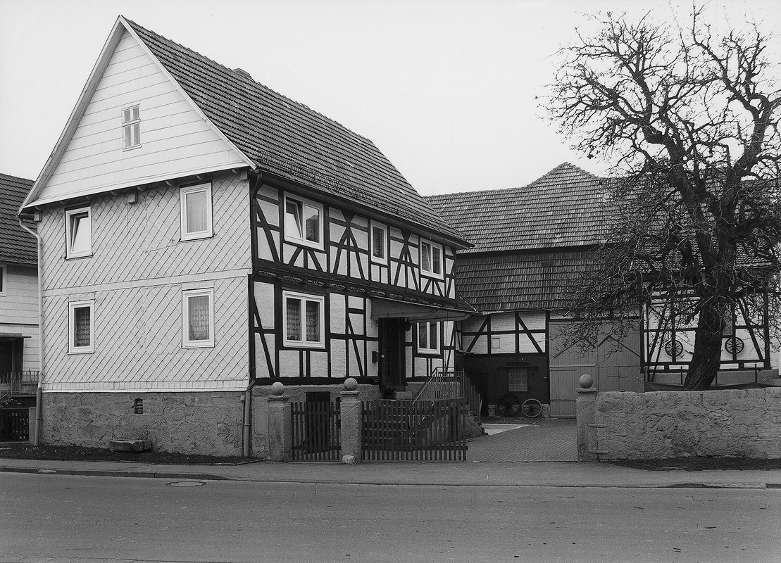 Hofanlage aus der zweiten Hälfte des 18. Jhs., Scheune 1751 datiert. Das giebelständige Wohnhaus über zwei Geschossen wird durch die Mannfiguren an den Eck- und Bundständern mit abknickenden Fußstreben im Bereich der Brustriegel geprägt. Der Eingang ist über eine zweiläufige Freitreppe erreichbar. Mit den erhaltenen Wirtschaftsgebäuden ist der Hof ein gutes Beispiel für den Aufbau eines bäuerlichen Anwesens um 1750 und daher aus sozialgeschichtlichen Gesichtspunkten schützenswert.