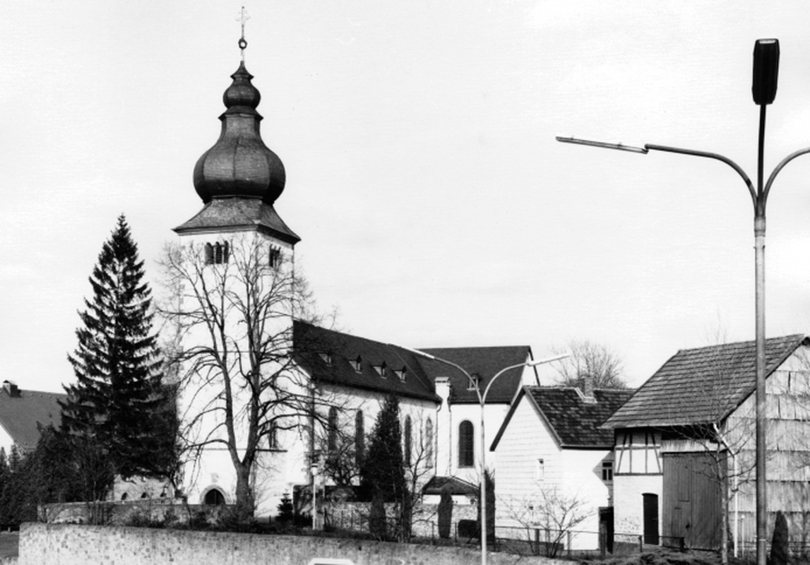 Die bestehende, barock überformte Anlage der Kirche entspricht in ihrem Grundriß und ihrer Bausubstanz noch weitgehend dem Gründungsbau des frühen 11.Jhs., der aus einem einschiffigen Langhaus von fast 45 m Länge und einem weit ausladenden, östlichen Querhaus bestand. Unmittelbar am Querschiff befand sich eine halbkreisförmige Apsis mit einer nach Westen vorstoßenden Krypta. Im Anschluß an das Langhaus war vermutlich noch eine niedrige Westvorhalle angebunden. Von dieser Anlage blieb die gesamte Ostpartie mit Querhaus in voller Höhe erhalten, lediglich das Langhaus büßte bei späteren Umbauten den oberen Teil der Längswände sowie wahrscheinlich die gesamte Westwand ein. Abgesehen von der Krypta beschränkte sich die ursprüngliche Ausstattung in Entsprechung zu dem strengen architektonischen Gerüst auf einen grauen, schmucklosen Estrichboden und weiß gekalkten Innenwänden mit geringen ornamentalen Malereien.