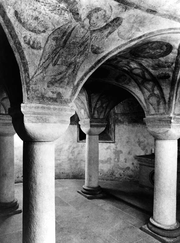 Von besonderer Bedeutung ist die über zwei Treppen zugängliche Hallenkrypta. Sie besitzt eine komplizierte Gewölbekonstruktion aus gurtlosen, sich durchdringenden Tonnengewölben, die von vier Säulen mit Würfelkapitellen getragen werden. Auf den Gewölben und in den Nischen der drei Fenster befindet sich eine 1932 entdeckte Ausmalung, die wohl aus der Erbauungszeit stammt und zwischen Ornamentbändern Figürliches zeigt: Christus in der Mandorla, Szenen aus dem alten und neuen Testament, Könige und Heilige in Medaillons, ein Engelfries. Die alten, seitlich der Treppe sichtbaren Chorschranken tragen außerdem noch eine Malerei aus der ersten Hälfte des 13.Jhs., wohl als thronende Apostel zu interpretieren.