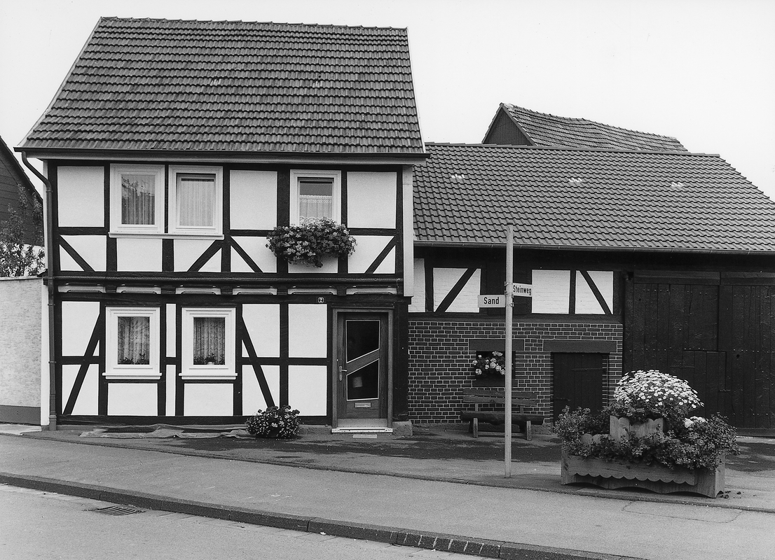 Um 1820 erbautes, traufseitig erschlossenes Wohnhaus an der Kreuzung Steinweg/Brauhausstraße/Sand. Einfacher, konstruktiver Fachwerkverband, an Füllhölzern und Schwelle doppelte Schiffskehlen mit Taustab als wiederverwendeter Schmuck. Als einsichtiger Blickpunkt aus der Brauhausstraße ist das Gebäude aus städtebaulichen und ortsgeschichtlichen Gründen erhaltenswert.