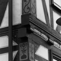 Giebelständiges Wohnhaus in repräsentativer Fachwerkkonfiguration.und ausgeprägten Schmuckformen. Über hohem Sandsteinsockel erhebt sich ein zweigeschossiger Aufbau mit lebhafter, klar gegliederter Fachwerkkonstruktion: an der als Schaufassade angelegten Traufseite finden sich Mannfiguren mit Hals- und Brustriegeln an Eck- und Bundständern mit zum Teil gebogenen