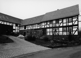 Großzügig dimensionierte hakenförmige Hofanlage: Fachwerkwohnhaus um 1780 in zwei Geschossen über hohem Sockel, Mannfiguren an den Eck-und Bundständern, im vorderen Bereich jüngere 3/4-Streben. Angeschlossen ist ein Stall-Scheune-Trakt, davon rechtwinklig abknickend Scheune in Ständerkonstruktion mit hoher Durchfahrt.