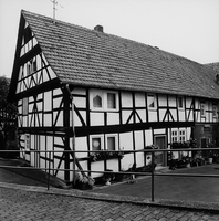 Fachwerkwohnhaus einer Hofanlage, um 1750 zu datieren, in zwei Geschossen mit repräsentativer Giebelseite: dort Mannfiguren mit Hals- und Brustriegeln an Eck- und Bundständern. Im Giebel Verstrebung eines liegenden Dachstuhls. Wirtschaftsgebäude aus der Erbauungszeit.