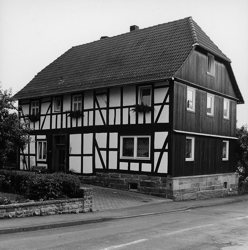 Giebelständiges, mit Krüppelwalmdach eingedecktes Wohnhaus in zwei Geschossen. Die Fachwerkfiguration in 3/4-Streben mit Brust- und Sturzriegeln folgt konstruktiven Vorgaben, so dass eine Datierung in die erste Hälfte des 19. Jhs. möglich ist.