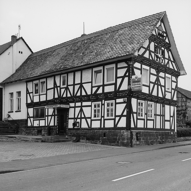 Prächtiges, mit reichen Schmuckformen versehenes zweigeschossiges Wohnhaus in einer Fachwerkkonfiguration aus der Mitte des 17. Jhs. als ortsbildprägender Blickpunkt im Verlauf der Vierbacher Straße. Im Schwellenbereich eingelegte Taustäbe und gepfeilte Bänder, an den Eckständern ebenfalls Taustäbe mit rahmendem Schneckenmotiv. Im Giebel Feuerböcke, darüber befindet sich als krönender Abschluß eine Fächerrosette.