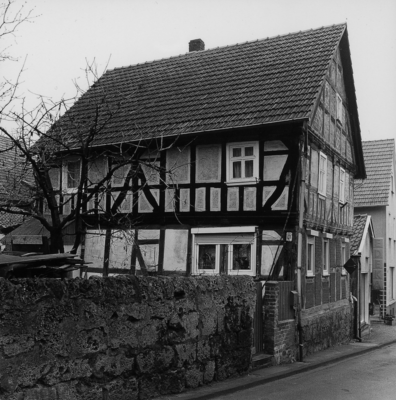 Giebelständiges Wohnhaus in zwei Geschossen über hohem, massivem Sockel mit lebhafter Fachwerkkonstruktion: an den Eckständern Mannfiguren, dazwischen Leitermotiv im Brüstungsbereich. Das Gebäude ist ins letzte Drittel des 18. Jhs. zu datieren. Etwas davon abgesetzt Wirtschaftsgebäude.